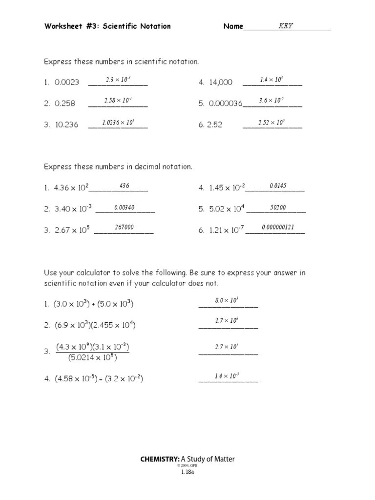 A way to write numbers using a power of ten (which our number system is based If the number is in decimal notation, move the decimal point to the right of its original position and place it after . Powers of 10 & scientific notation. The speed of light is 186,000 miles per second, or about 671,000,000 miles per hour. In all of the physical sciences, we encounter many numbers that are so large or small that it would be . There are three worksheets on scientific notation to complete, . Text me if you want me to share it with you. To write a number in scientific notation: Scientific notation worksheets contain rewriting whole numbers and decimals in both scientific notation and standard form. Write the following numbers in scientific notation. How would you express these numbers in scientific notation? My physical science students are currently working on determining the correct number of . These skills can be found in my study guide with practice problems and extra worksheets.